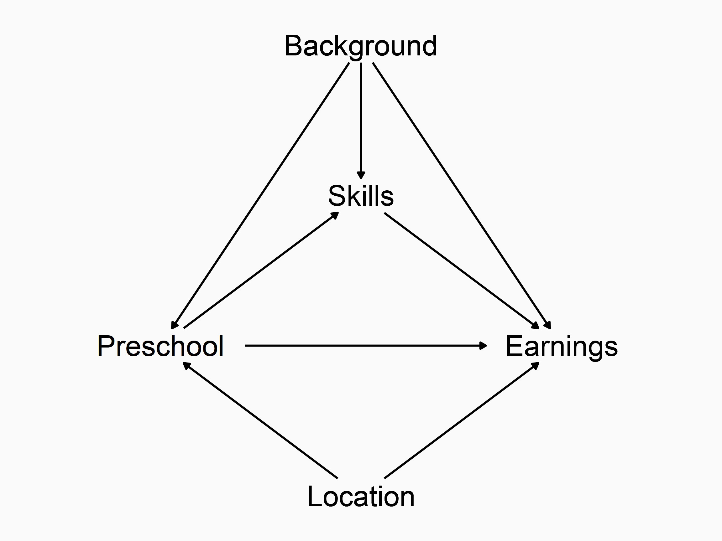 Also, can we control for those things? What would it mean to assign a single number for \(Background\) to someone? Or if we’re representing \(Background\) with multiple variables - race, gender, parental income, etc., how do we know if we’ve fully covered it?