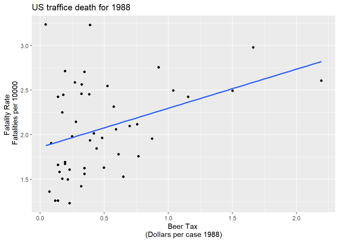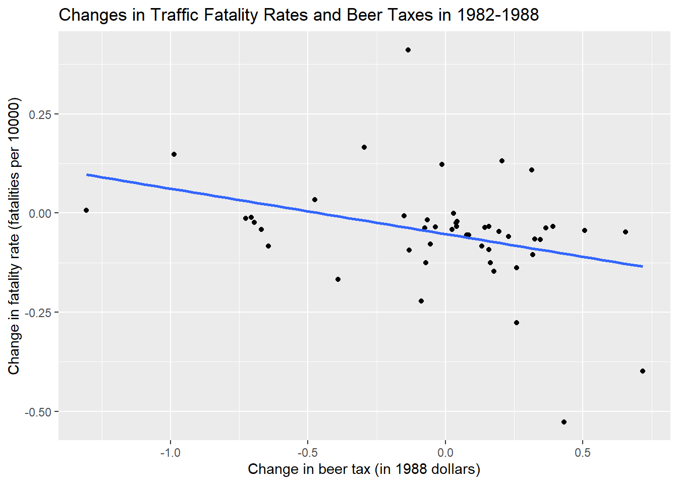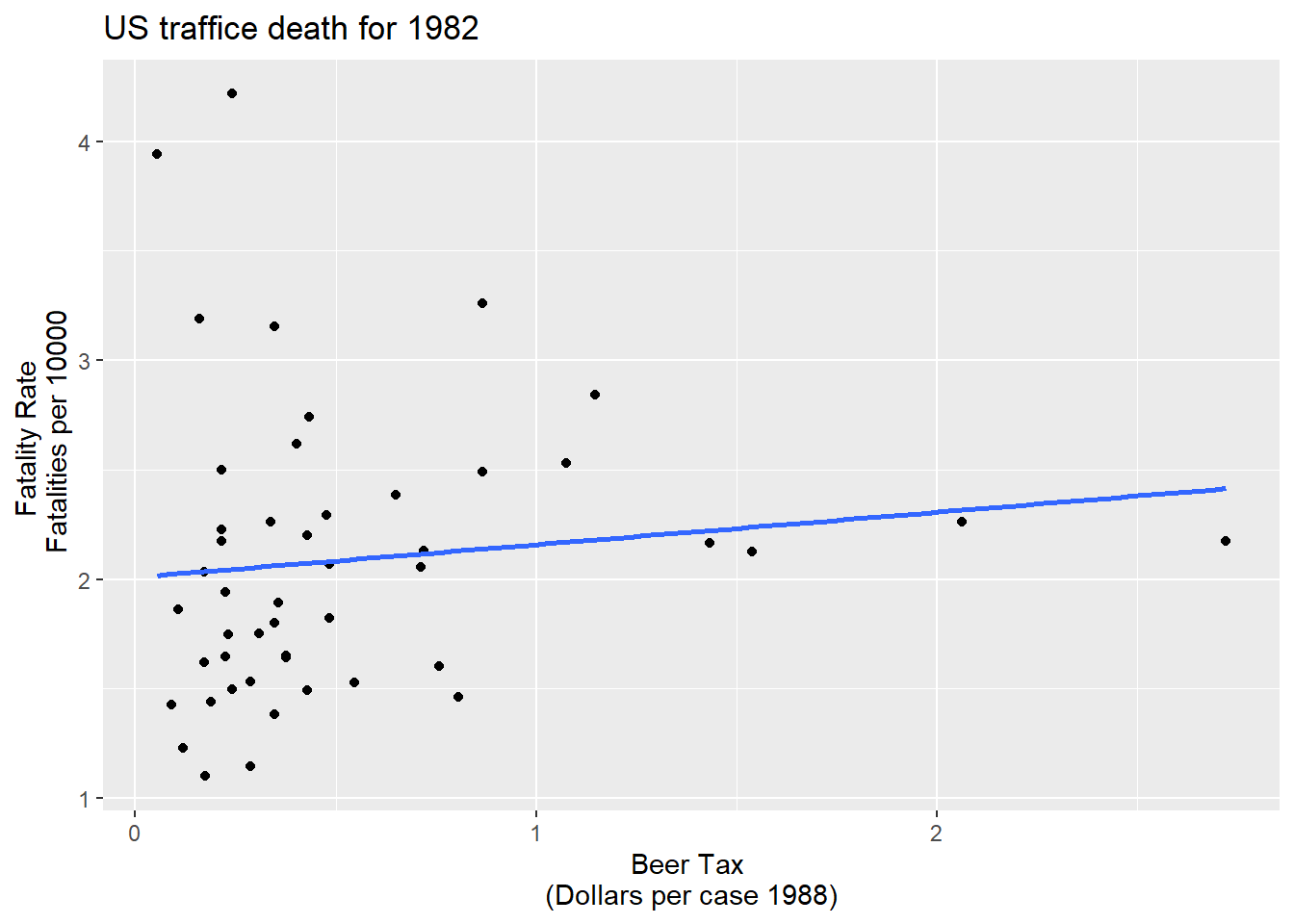 Fatalities1988 <- df %>% filter(year=="1988")ggplot(Fatalities1982)+aes(x= beertax,y=fatal_rate)+geom_point()+geom_smooth(method = "lm", se=FALSE)+labs(x="Beer Tax \n(Dollars per case 1988)",y="Fatality Rate \n Fatalities per 10000", title="US traffice death for 1982")`geom_smooth()` using formula 'y ~ x'
