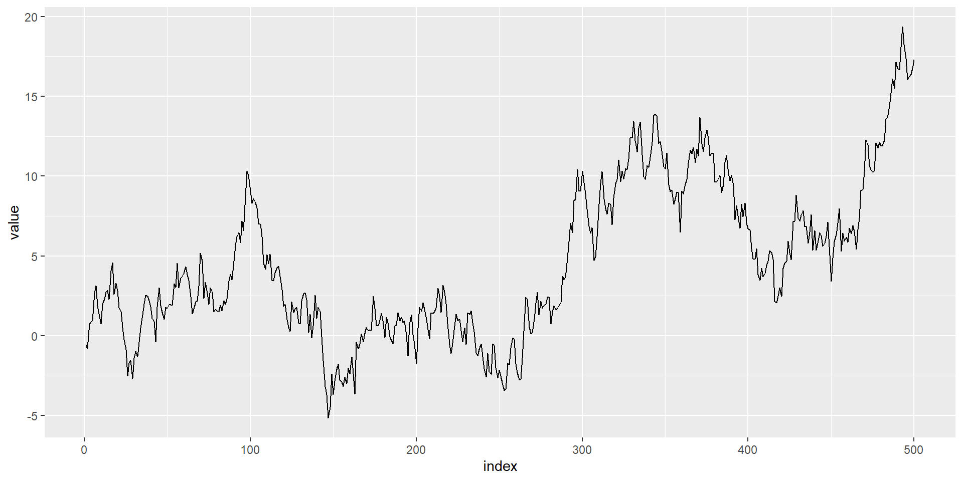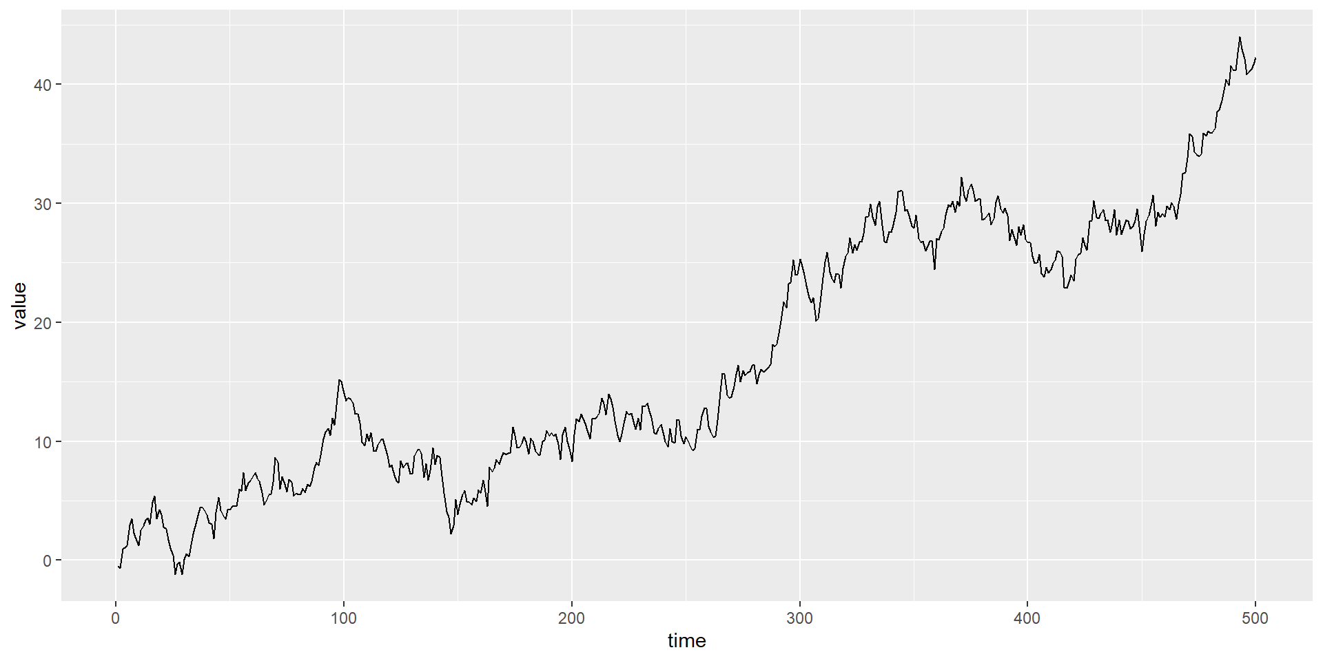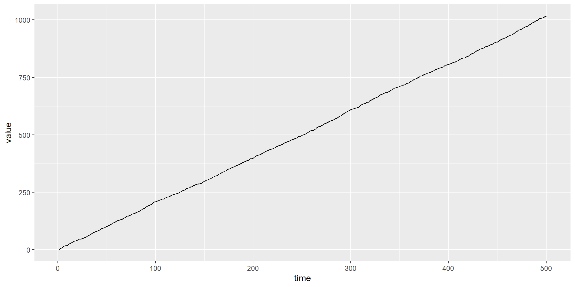Random Walk with Drift: \(y_t=\mu+y_{t-1}+\epsilon_t\) (as before, \(\epsilon_t\) is iid)