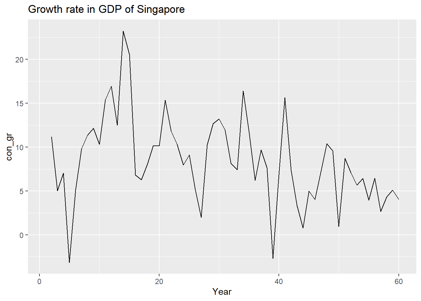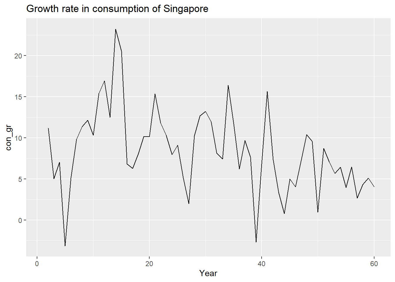 The reason for the failure of trend fit may be due to the reasonable assumption that the growth rate is stable across time, so that $con_gr=(SgpCon-lag(SgpCon,1))/lag(SgpCon,1)*100$,$gdp_gr=(SgpGDP-lag(SgpGDP,1))/lag(SgpGDP,1)*100$,$gdp_gr_Saf=(SAfGDP-lag(SAfGDP,1))/lag(SAfGDP,1)*100$ would be uncorrelated with time. This can be checked by graphing this variable against time, as follows: